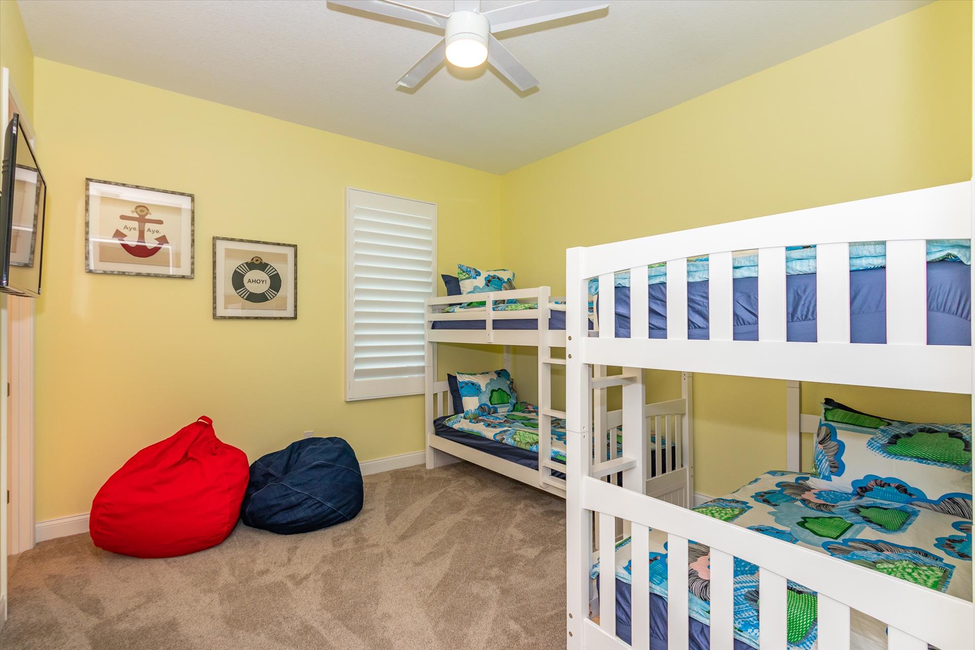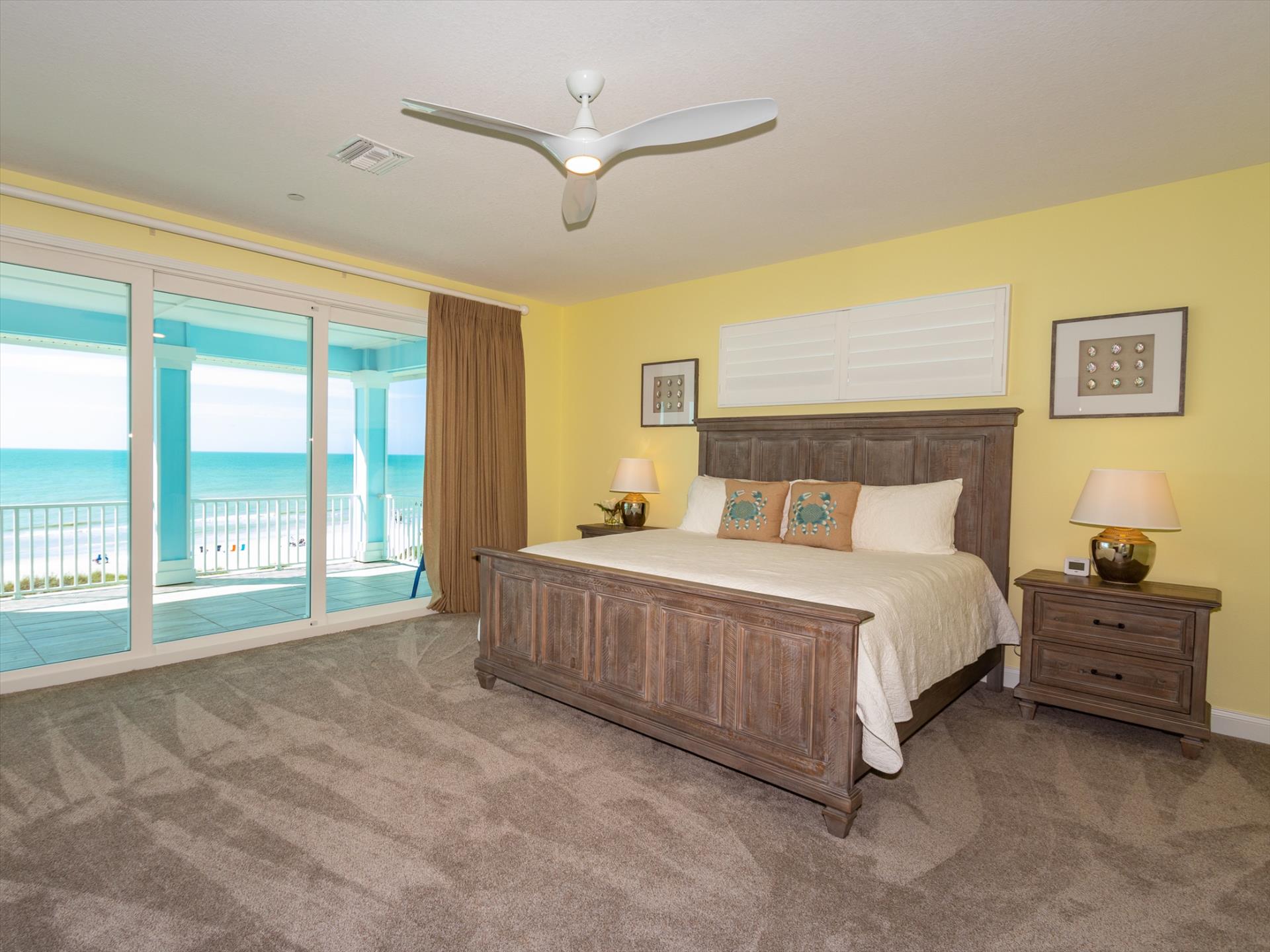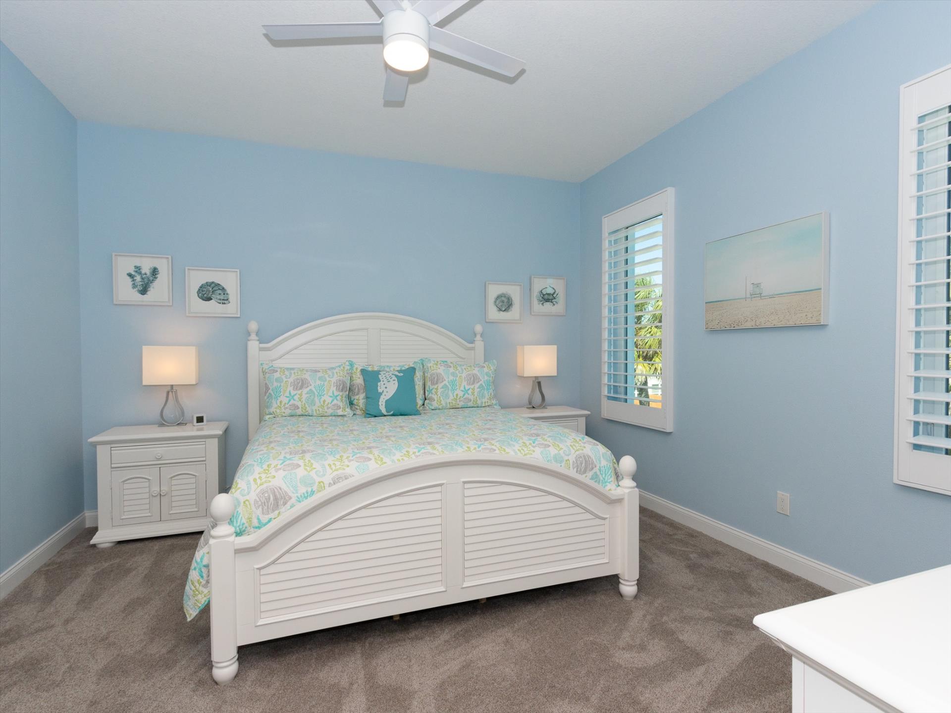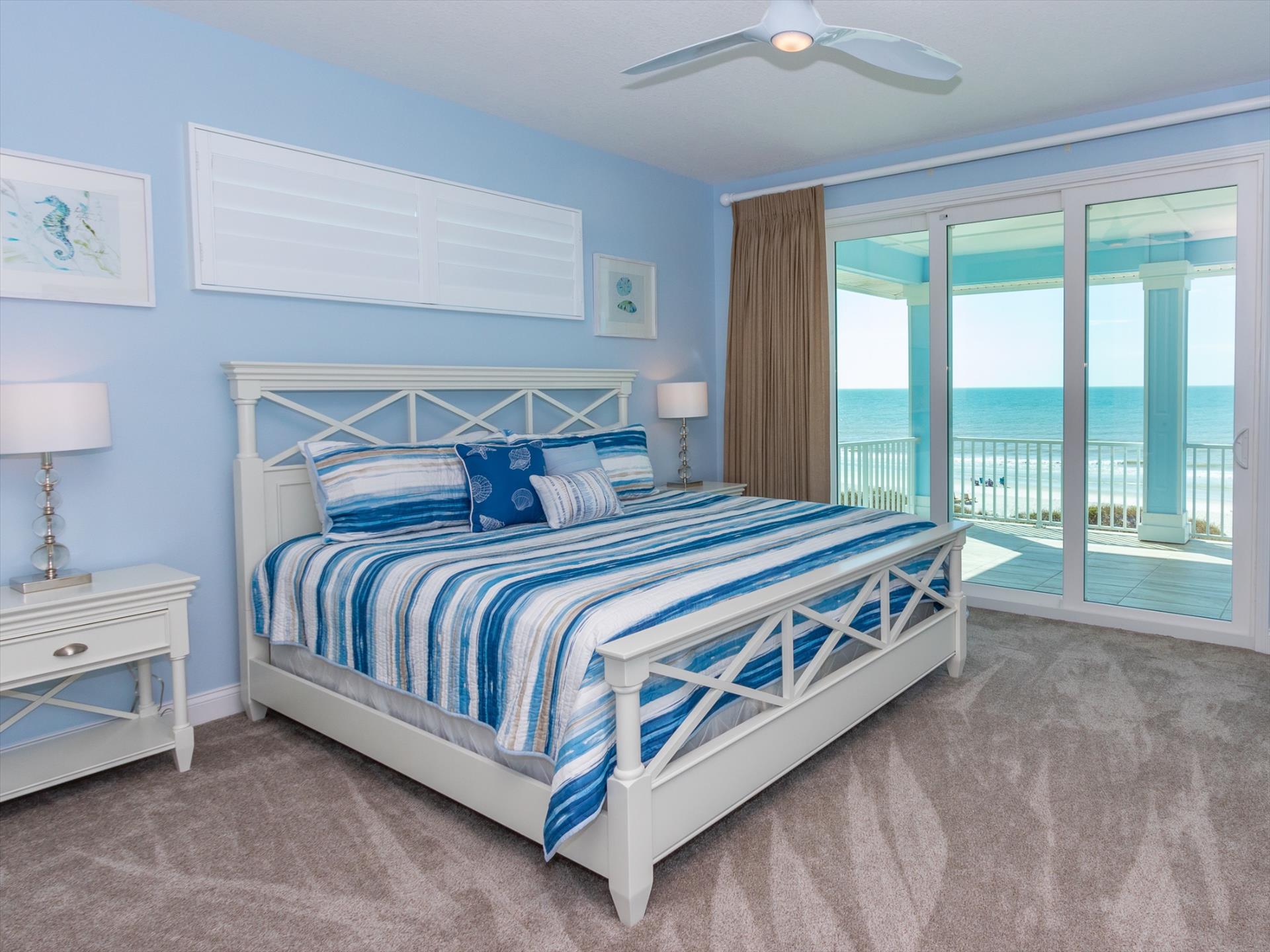On the second floor you will walk into a large open living area with huge windows overlooking the beach. The living area also has a large sofa with flat screen TV. There is a fantastic kitchen featuring a gas hob and stove, electric combo oven/microwave, refrigerator and dishwasher with seating for 6 at the island. There is also a wet bar and breakfast nook together with a formal dining area. You can step out onto the balcony to BBQ or sit out and enjoy the breathtaking views. On this level there are two bedrooms, one with a king bed, the other with two sets of bunk beds, which will only accommodate children. These bedrooms share a Jack'n'Jill bathroom with shower. There is also a half bathroom for guests to use off of the living area.