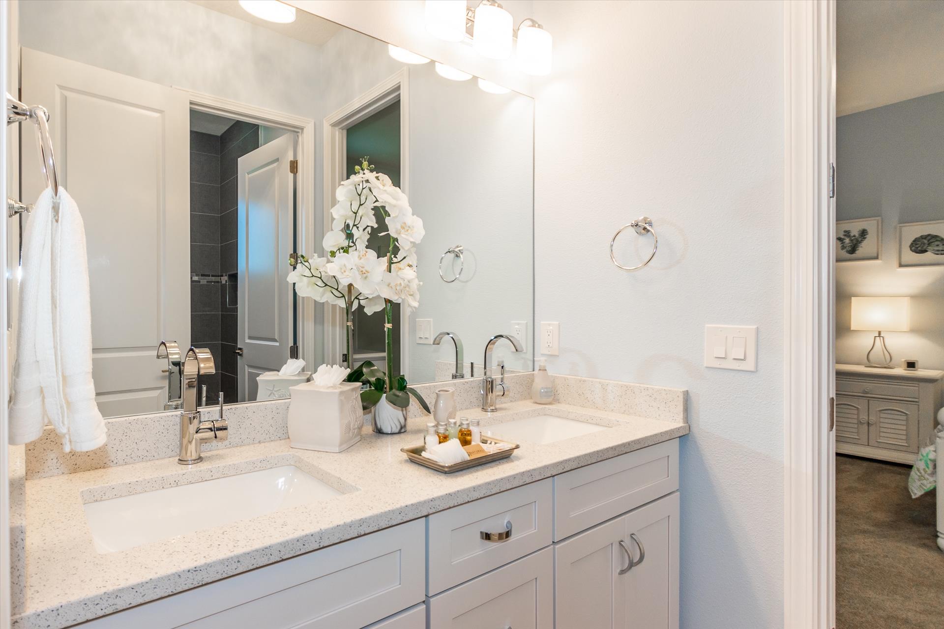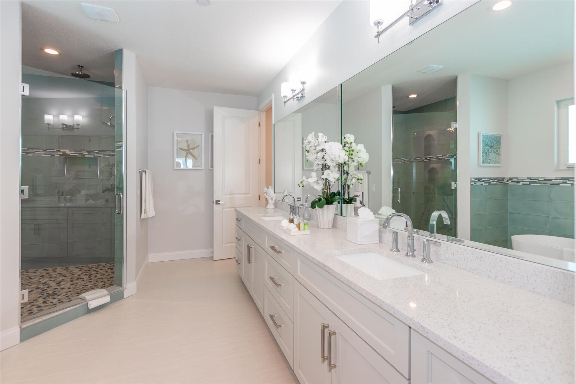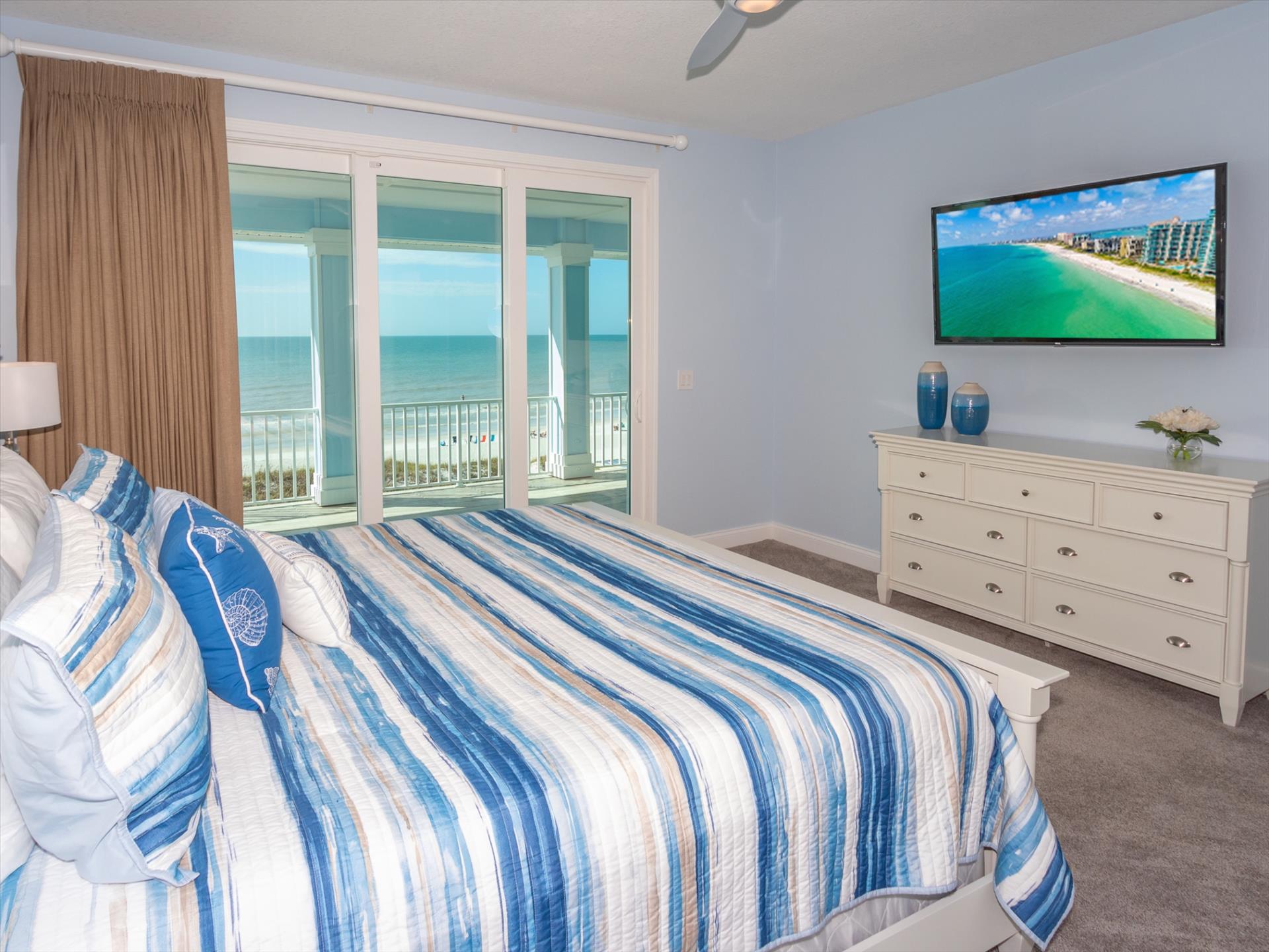 The third floor consists of the remaining 4 bedrooms. The master bedroom has a king bed and large walk in closet. The master bathroom features a soaking tub and separate walk in shower as well as a double sink/vanity unit. Bedroom 2 has a king bed and an en suite tub/shower combination. This bedroom and the master share a large balcony with incredible views of the beach and the Gulf of Mexico. The other two bedrooms on this floor share a Jack'n'Jill bathroom. One bedroom has a queen bed, the other a king bed. There is also a laundry room on the 3rd floor. All bedrooms have a flat screen smart TV.