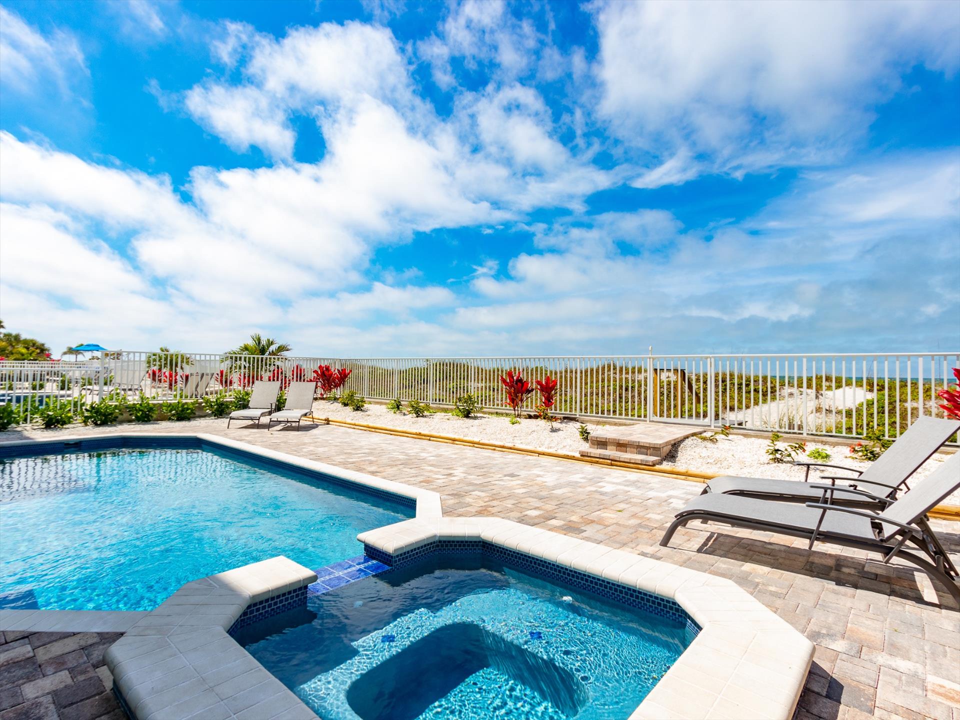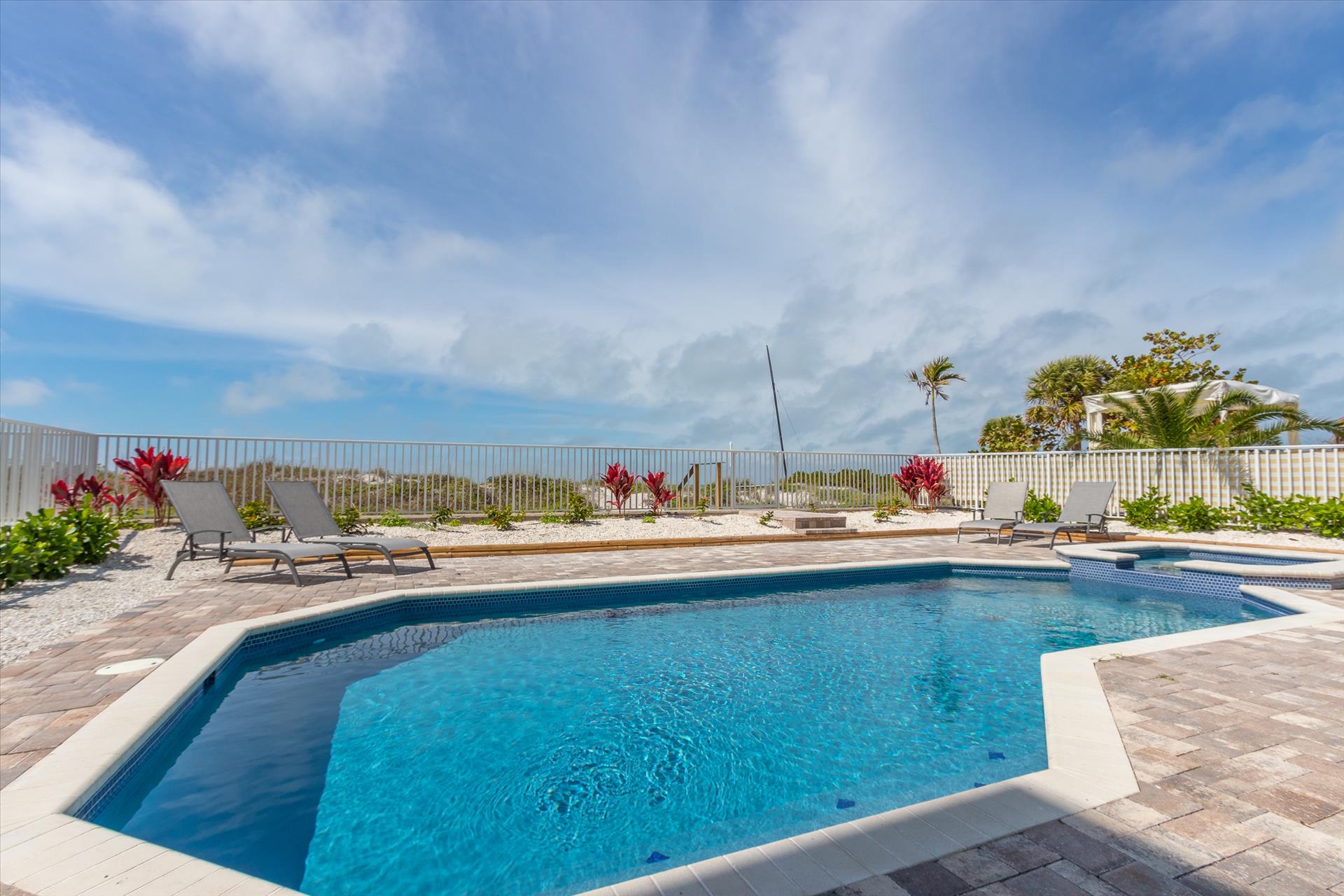 The rear of the property has a pool and hot tub, with sunbeds and seating for you and your party to relax in. There is also an outdoor shower for you to rinse off after a dip in the warm Gulf of Mexico which is just steps away. There are plenty of amenities and toys for your use. We have beach chairs and umbrellas, Paddle boards and Kayaks available for your use*. There is also a full crib, pack-n-play, high chair and baby gates for your convenience.