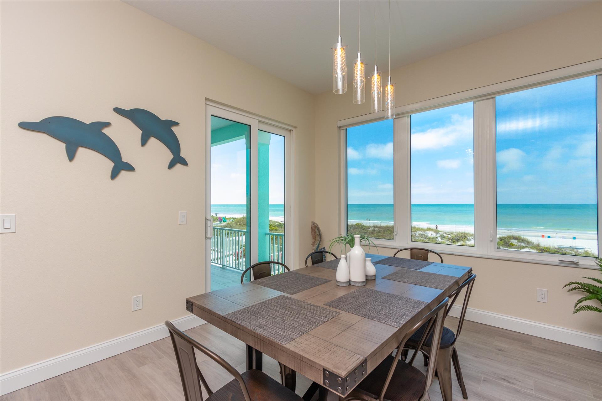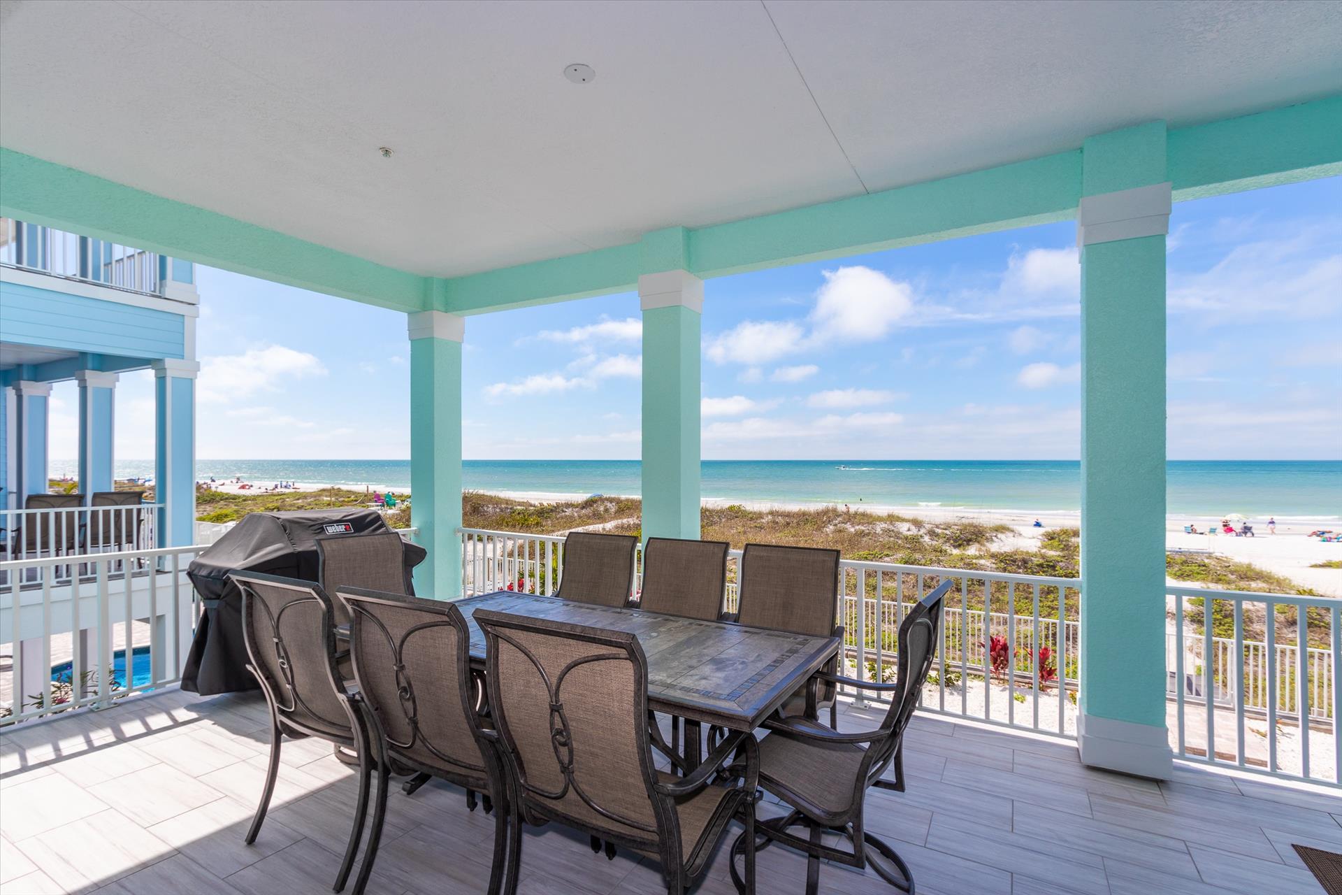 The second floor has a fantastic kitchen featuring a gas hob and stove, electric combo oven/microwave, refrigerator and dishwasher with seating for four at the island. There is also a wet bar and breakfast nook together with a formal dining area and a large sitting area with flat screen TV. There is a huge balcony that has sweeping views up and down the miles of white sandy beaches of Indian Rocks Beach. There is an outdoor bar area, Weber grill as well as space for dining and relaxation.