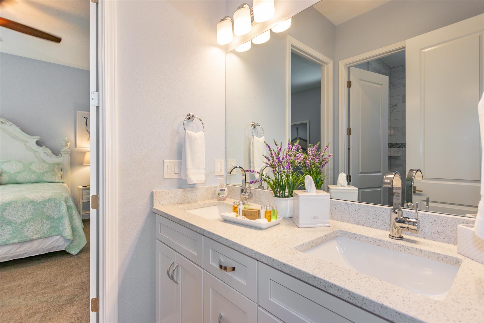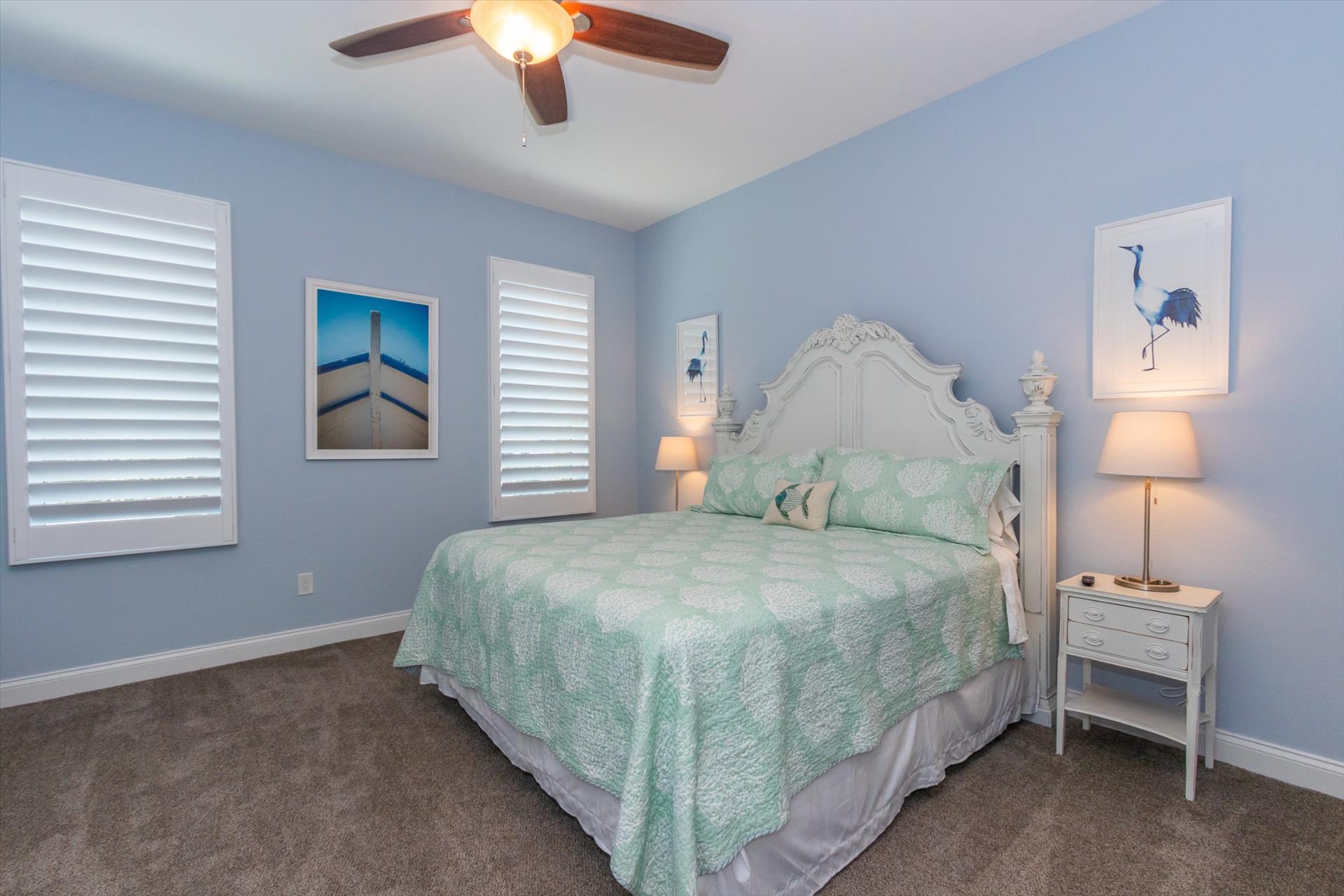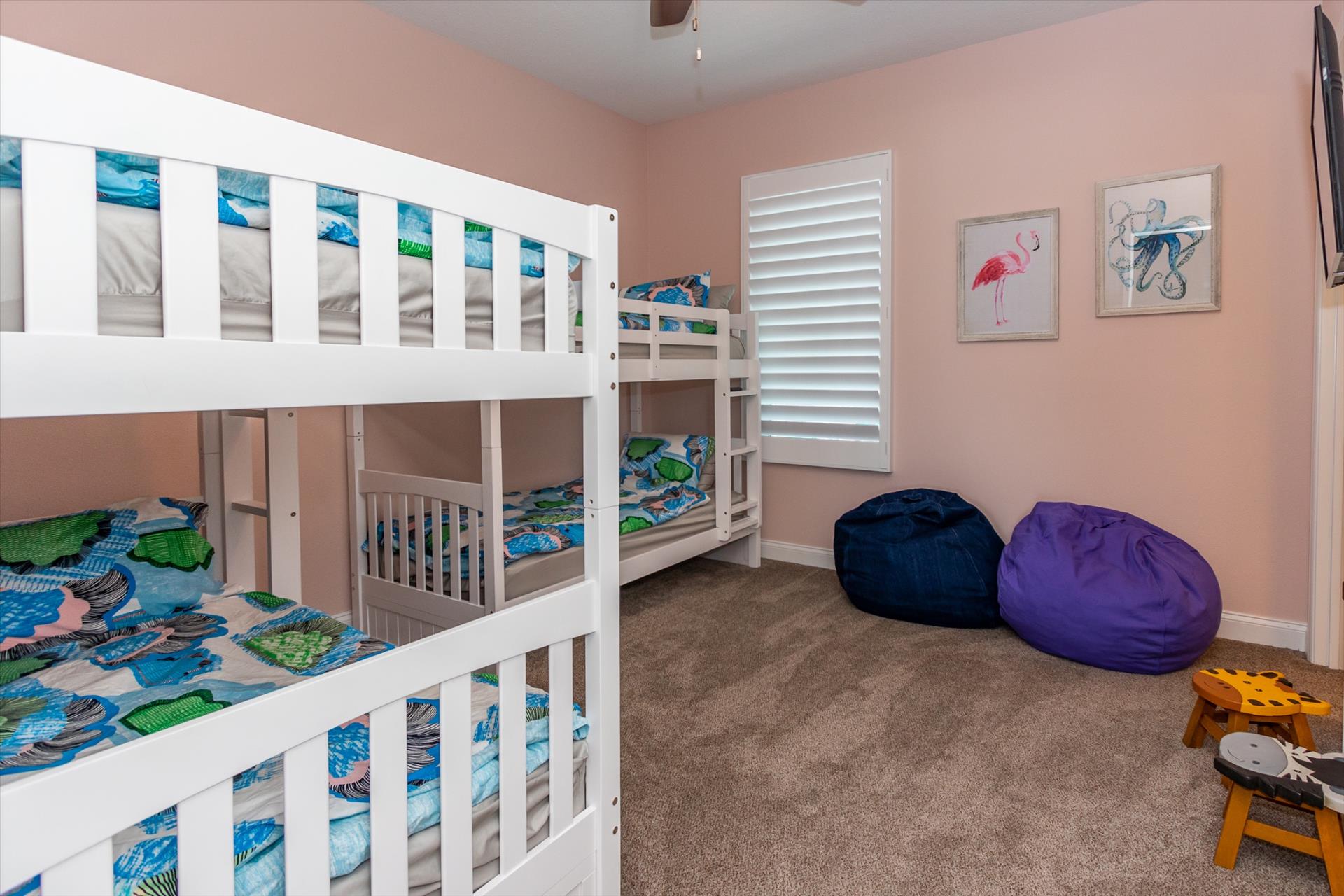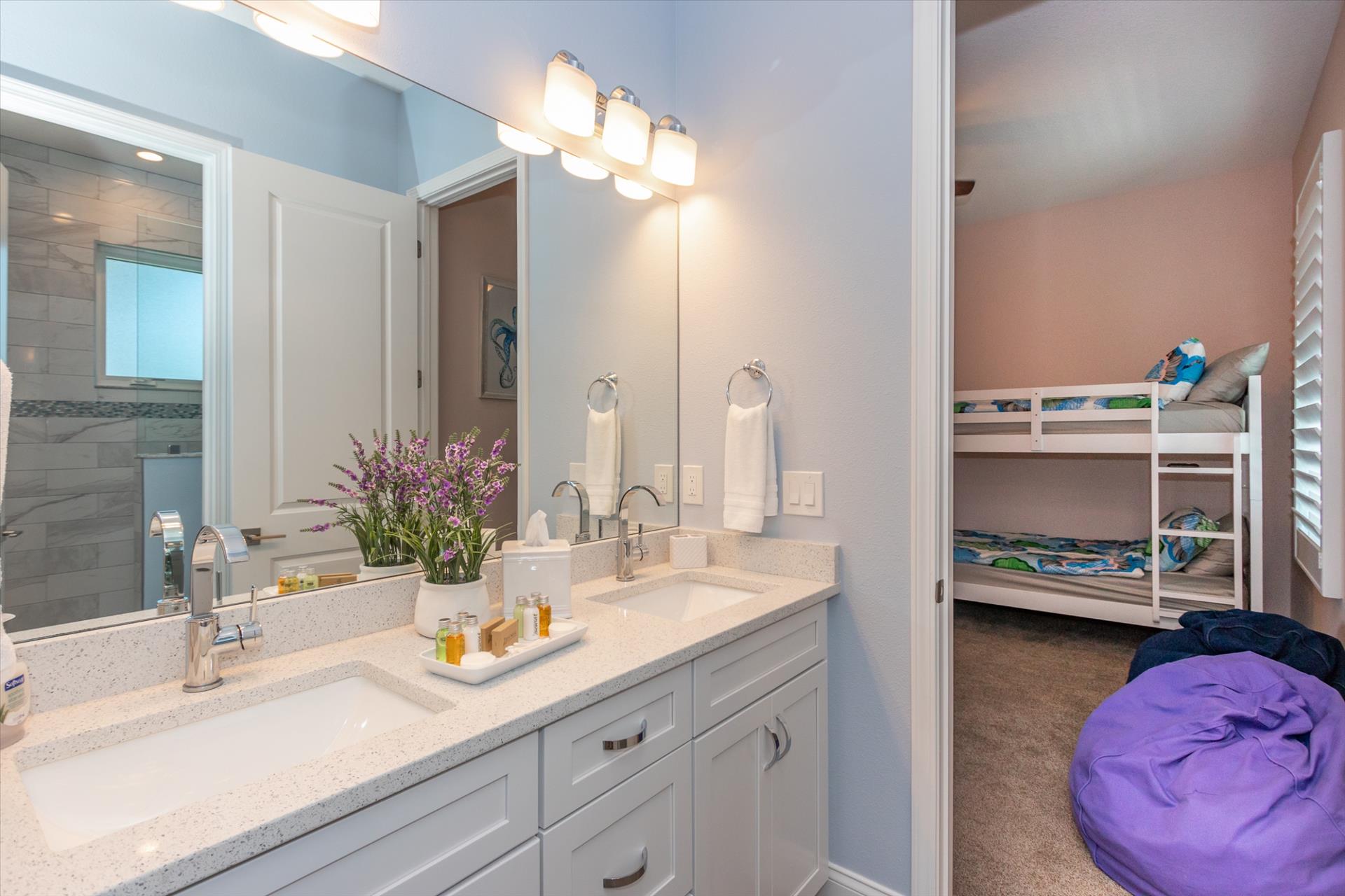 On this level are two bedrooms, one with a king bed, the other with two sets of bunk beds, which will only accommodate children, these share a Jack'n'Jill bathroom. There is also a half bathroom for guests to use off of the living area.