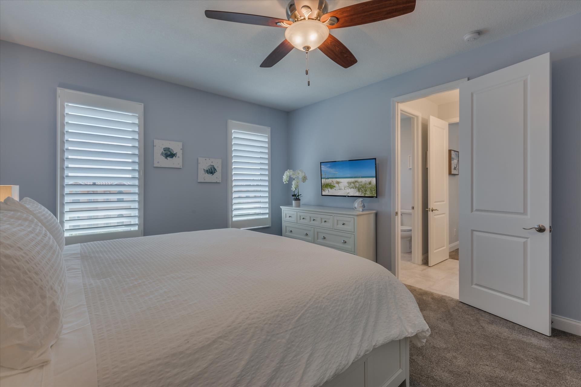 The other two bedrooms on this floor share a Jack'n'Jill bathroom. One bedroom has a queen bed, the other a king bed. There is also a laundry room on the 3rd floor. All bedrooms have a flat screen TV.